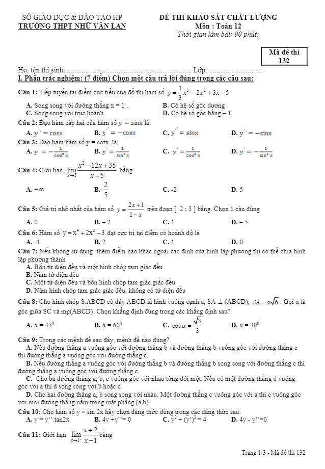 Đề thi kiểm tra học kỳ 1 môn Toán lớp 12 năm học 2018 – 2019 của trường THPT Nhữ Văn Lan ở Hải Phòng là một bài kiểm tra quan trọng nhằm đánh giá kiến thức của học sinh sau kỳ nghỉ hè và kiểm tra lại nền tảng kiến thức từ lớp 11. Đề thi được biên soạn theo hình thức trắc nghiệm kết hợp với phần tự luận, với tỷ lệ điểm phân chia rõ ràng.Phần trắc nghiệm của đề thi bao gồm 28 câu hỏi, chiếm 70% tổng số điểm, nhằm kiểm tra khả năng làm bài nhanh và chính xác của học sinh. Trong khi đó, phần tự luận với 3 bài toán, chiếm 30% tổng số điểm, đánh giá khả năng suy luận và giải quyết vấn đề của học sinh.Trong đề thi, có những câu hỏi đòi hỏi học sinh phải áp dụng kiến thức Toán học lớp 12 một cách linh hoạt và chính xác. Ví dụ như câu hỏi về việc chia hình lập phương thành các hình khối đều, hoặc câu hỏi về giá trị lớn nhất và nhỏ nhất của hàm số.Để làm bài thi tốt, học sinh cần phải ôn tập cẩn thận và hiểu rõ từng khái niệm, công thức và quy tắc Toán học. Chỉ khi có kiến thức nền tảng vững chắc, học sinh mới có thể tự tin và thành thạo khi giải các bài toán trong đề thi kiểm tra này.Những câu hỏi khó trong đề thi được hướng dẫn giải chi tiết và logic, giúp học sinh hiểu rõ và nâng cao khả năng giải quyết vấn đề. Đây là cơ hội tốt để học sinh tự kiểm tra và cải thiện kỹ năng Toán học của mình, từ đó nâng cao điểm số và hiệu suất học tập.Đề thi KSCL Toán lớp 12 năm học 2018 – 2019 của trường THPT Nhữ Văn Lan ở Hải Phòng là một cơ hội để học sinh thể hiện sự kiến thức và khả năng của mình trong môn học quan trọng này. Đây cũng là dịp để thầy cô giáo đánh giá và hướng dẫn học sinh để họ phát triển tốt hơn trong học tập.