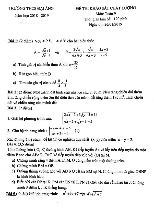 Đề thi KSCL Toán lớp 9 năm học 2018 – 2019 tại trường THCS Đại Áng Hà Nội bao gồm 01 trang với 05 bài toán tự luận. Thời gian làm bài cho học sinh là 90 phút, và kỳ thi diễn ra vào ngày 26 tháng 01 năm 2019.