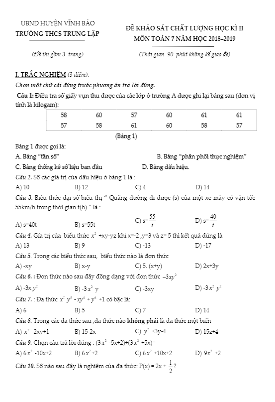 Trong bài viết này, chúng ta sẽ cùng nhau chiêm ngưỡng đề thi Toán lớp 7 môn Toán học kì 2 năm học 2018-2019 của trường THCS Trung Lập, huyện Vĩnh Bảo, thành phố Hải Phòng. Đề thi gồm tổng cộng 20 câu hỏi, bao gồm 15 câu trắc nghiệm và 5 câu tự luận. Học sinh sẽ có 90 phút để hoàn thành bài thi và đề thi đi kèm với đáp án và lời giải chi tiết.