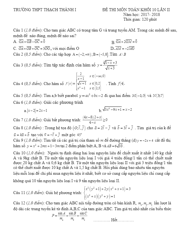 Đề thi môn Toán khối 10 lần 2 năm 2017-2018 trường Thạch Thành 1 Thanh Hóa