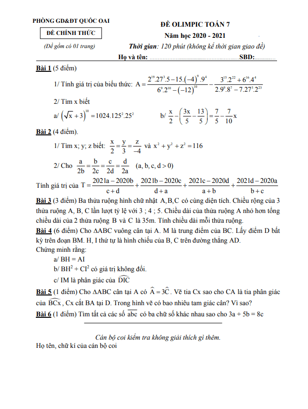 Chào mừng đến với đề thi Olimpic Toán lớp 7 năm 2020 – 2021 của phòng GD&ĐT Quốc Oai – Hà Nội. Đề thi này bao gồm các câu hỏi và bài toán thú vị dành cho các em học sinh lớp 7.