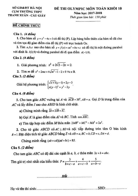 Đề thi Olympic Toán lớp 10 năm 2017-2018 cụm trường Thanh Xuân & Cầu Giấy – Hà Nội