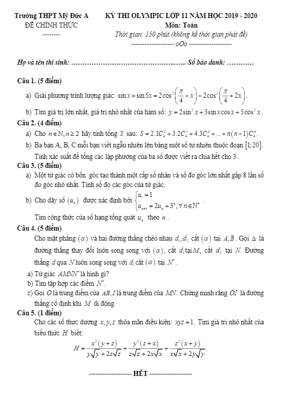 Đề thi Olympic Toán lớp 11 năm học 2019 – 2020 của trường THPT Mỹ Đức A ở Hà Nội là một bộ đề thi khá đa dạng và thú vị, được thiết kế để kiểm tra và đánh giá kiến thức của học sinh trong môn Toán. Đề thi gồm 5 bài toán, dành cho học sinh có thời gian làm bài là 150 phút. Một trong những bài toán trong đề thi là bài toán về mặt phẳng và đường thẳng, yêu cầu học sinh phải tư duy logic và sử dụng kiến thức về hình học để giải quyết vấn đề. Bài toán khá thú vị với nhiều khía cạnh đáng explore và làm học sinh phải suy nghĩ sáng tạo. Ngoài ra, đề thi cũng có bài toán về xác suất và bài toán về tứ giác. Cả hai bài toán này đều đòi hỏi học sinh phải áp dụng kiến thức và kỹ năng tính toán một cách chính xác và có logic. Với đề thi này, học sinh sẽ được thách thức và khích lệ phát triển tư duy logic, khả năng giải quyết vấn đề và tính toán của mình. Đồng thời, đề thi cũng giúp học sinh rèn luyện sự kiên nhẫn, sự chăm chỉ và khả năng làm việc độc lập. Đề thi Olympic Toán lớp 11 năm học 2019 – 2020 của trường THPT Mỹ Đức A ở Hà Nội không chỉ là cơ hội để học sinh thể hiện khả năng mà còn là cơ hội để học sinh học hỏi và phát triển bản thân. Đây thực sự là một bài kiểm tra thú vị và bổ ích đối với các em học sinh đam mê Toán học.