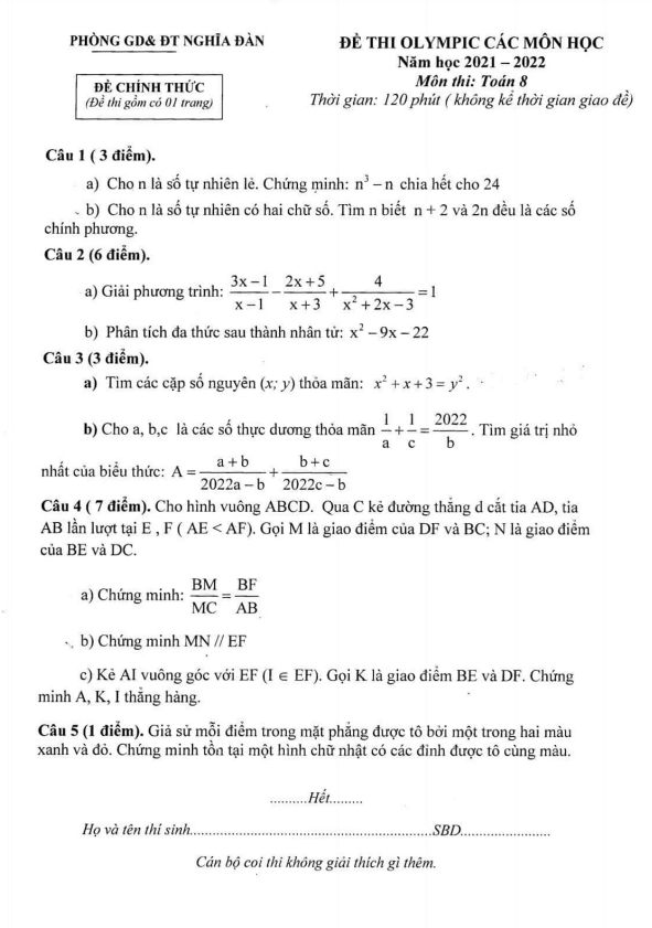 Đề Thi Olympic Toán Lớp 8 Năm 2021 – 2022 Phòng GD&ĐT Nghĩa Đàn Nghệ An