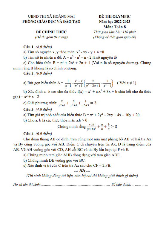 Đề thi Olympic Toán lớp 8 phòng GD&ĐT Hoàng Mai – Nghệ An năm 2022 – 2023