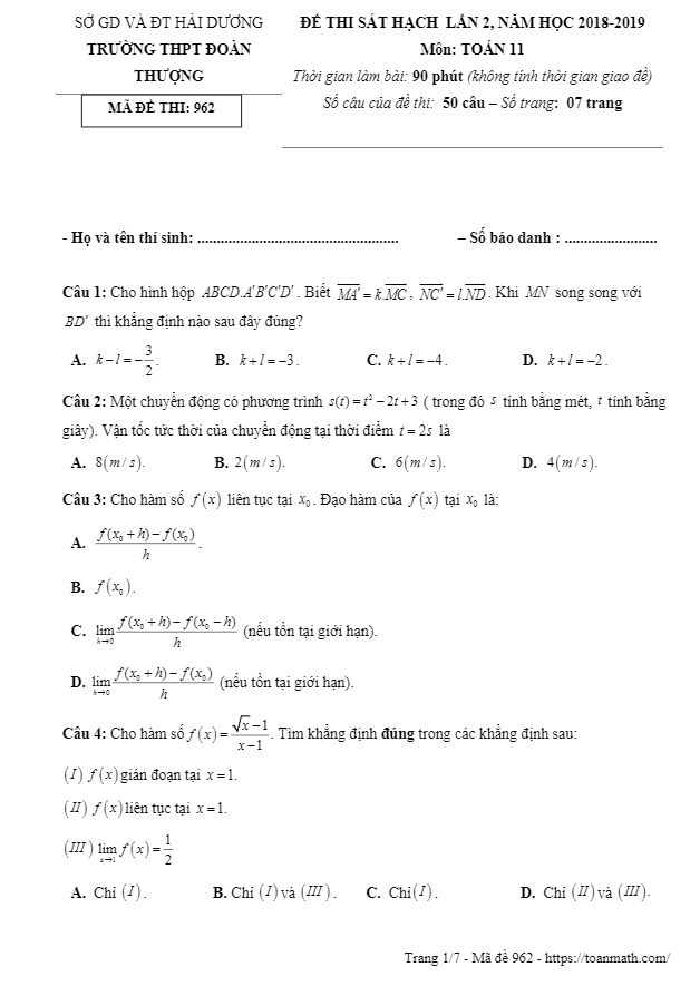 Đề thi sát hạch lần 2 môn Toán lớp 11 năm 2018 – 2019 của trường THPT Đoàn Thượng Hải Dương đã được tổ chức nhằm đánh giá kiến thức mà học sinh đã học trong học kỳ vừa qua. Đề thi có mã 962, bao gồm 50 câu hỏi và bài toán được biên soạn dưới dạng đề trắc nghiệm, mỗi câu có 4 đáp án để học sinh chọn lựa. Học sinh sẽ được điểm tương ứng với câu trả lời đúng, 0.2 điểm cho mỗi câu. Thời gian làm bài là 90 phút và đề thi có đáp án.Một số câu hỏi trong đề thi bao gồm:1. Trong không gian cho mặt phẳng (P) và điểm M không thuộc mặt phẳng (P), mệnh đề nào sau đây đúng?2. Xác suất để đoạn mạch điện có dòng điện chạy qua.3. Mệnh đề nào trong các câu sau đây là đúng về mối quan hệ giữa đường thẳng, mặt phẳng và vuông góc.Đề thi sẽ giúp học sinh tự đánh giá kiến thức của mình và chuẩn bị tốt cho kỳ thi cuối kỳ. Qua việc tham gia vào đề thi này, học sinh có cơ hội làm quen với cấu trúc đề thi và rèn luyện kỹ năng giải các bài toán một cách nhanh chóng và chính xác. Đề thi cũng giúp học sinh ôn tập và khám phá các khái niệm mới trong môn Toán, từ đó nâng cao kiến thức và kỹ năng của mình.