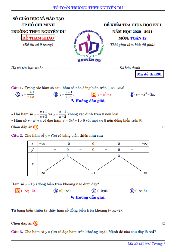 Đề thi tham khảo giữa HKI lớp 12 môn Toán năm 2020-2021 trường THPT Nguyễn Du TP HCM