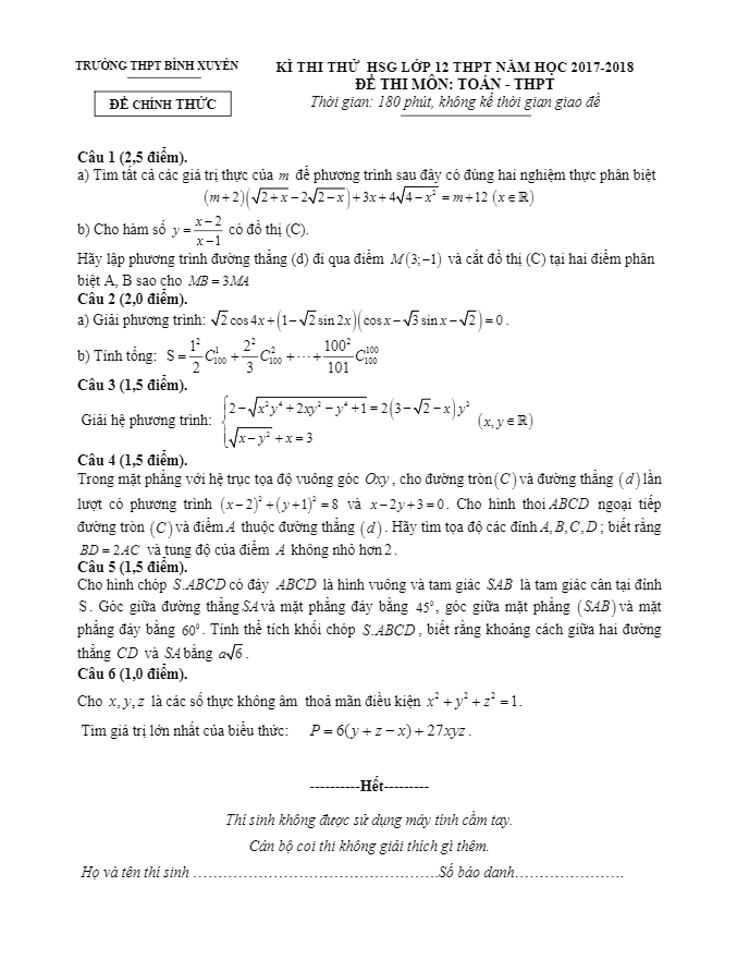 Đề thi thử HSG lớp 12 môn Toán THPT năm học 2017 2018 trường THPT Bình Xuyên Vĩnh Phúc