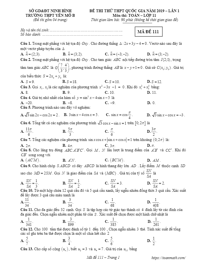 Đề thi thử Toán lớp 11 THPT Quốc gia 2019 trường Yên Mô B – Ninh Bình lần 1 được biên soạn để giúp các em học sinh khối 11 chuẩn bị tốt cho kỳ thi quan trọng. Đề thi giúp các em làm quen với cấu trúc và dạng bài thi, đồng thời rèn luyện khả năng giải quyet các bài toán một cách linh hoạt. Đề thi có mã đề 111, bao gồm 50 câu hỏi trắc nghiệm trên 04 trang, thời gian làm bài 90 phút. Để giúp các em kiểm tra và tự đánh giá kiến thức, đề thi đi kèm đáp án của các mã đề 111, 112, 113, 114.