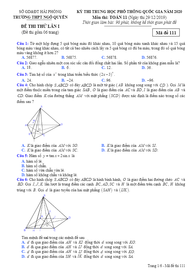 Đề thi thử Toán lớp 11 THPT Quốc gia 2020 lần 1 trường Ngô Quyền – Hải Phòng có mã đề 111 với 50 câu trắc nghiệm trải dài trên 06 trang. Học sinh được cung cấp 90 phút để hoàn thành bài thi.