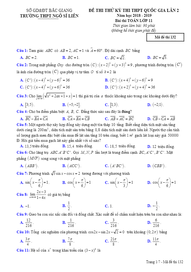 Đề thi thử lớp 11 môn Toán THPTQG 2019 trường Ngô Sĩ Liên Bắc Giang: Mở rộng nội dung kiến thức