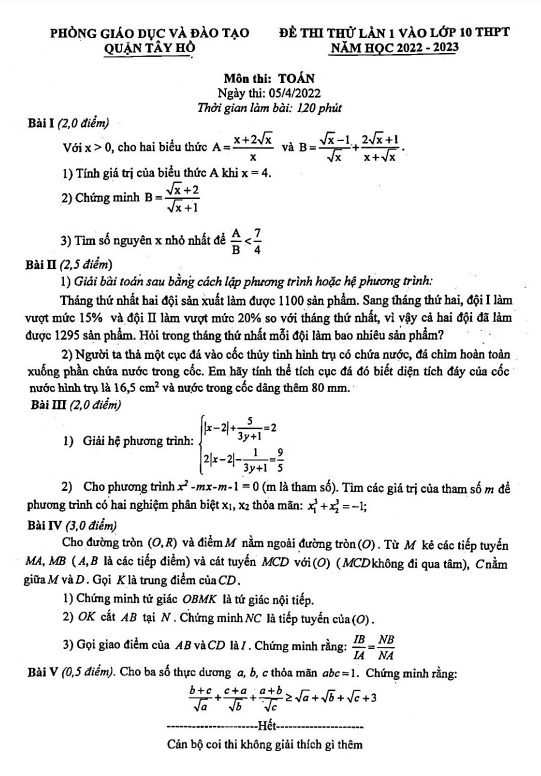 Đề thi thử Toán lần 1 vào năm 2022 2023 phòng GD ĐT Tây Hồ Hà Nội