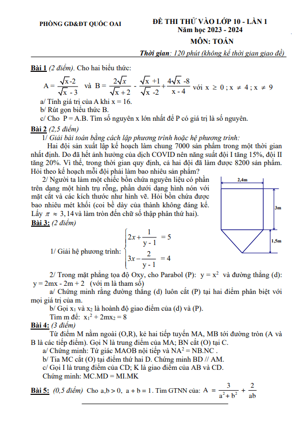 Đề thi thử Toán vào 10 lần 1 năm 2023 2024 phòng GD ĐT Quốc Oai Hà Nội