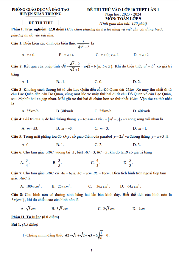 Đề thi thử Toán vào lớp 10 lần 1 năm 2023 – 2024 phòng GD&ĐT Xuân Trường – Nam ĐịnhChào đón quý thầy cô và các em học sinh lớp 9! Sytu xin giới thiệu đến mọi người đề thi thử môn Toán tuyển sinh vào lớp 10 THPT lần 1 năm học 2023-2024 từ phòng Giáo dục và Đào tạo huyện Xuân Trường, tỉnh Nam Định.Đề thi có cấu trúc gồm 20% câu trắc nghiệm và 80% câu tự luận, thời gian làm bài là 120 phút. Bạn sẽ có cơ hội để tự kiểm tra kiến thức và kỹ năng trong môn Toán để chuẩn bị tốt nhất cho kỳ thi sắp tới. Đề thi cũng đi kèm đáp án, lời giải chi tiết và hướng dẫn cách chấm điểm.Một số câu hỏi thú vị trong đề thi bao gồm:1. Xe máy thứ nhất và thứ hai di chuyển từ cầu Lạc Quần đến cầu Đò Quan, nếu xe máy thứ hai đi chậm hơn xe thứ nhất 10 km/h, hỏi vận tốc của xe thứ nhất là bao nhiêu? (A. 35km/h B. 30km/h C. 25km/h D. 40km/h)2. Tính diện tích của hình được giới hạn bởi tam giác ABC và hình tròn có đường kính BH nếu biết AB = 2√3 cm.3. Chứng minh các tính chất của các tứ giác và hình học khác trong đề thi.Hãy tham gia và thử sức với đề thi này để nâng cao khả năng giải quyết bài toán Toán của bạn. Chúc các em thành công!