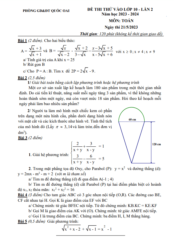Đề thi thử Toán vào 10 lần 2 năm 2023 2024 phòng GD ĐT Quốc Oai Hà Nội