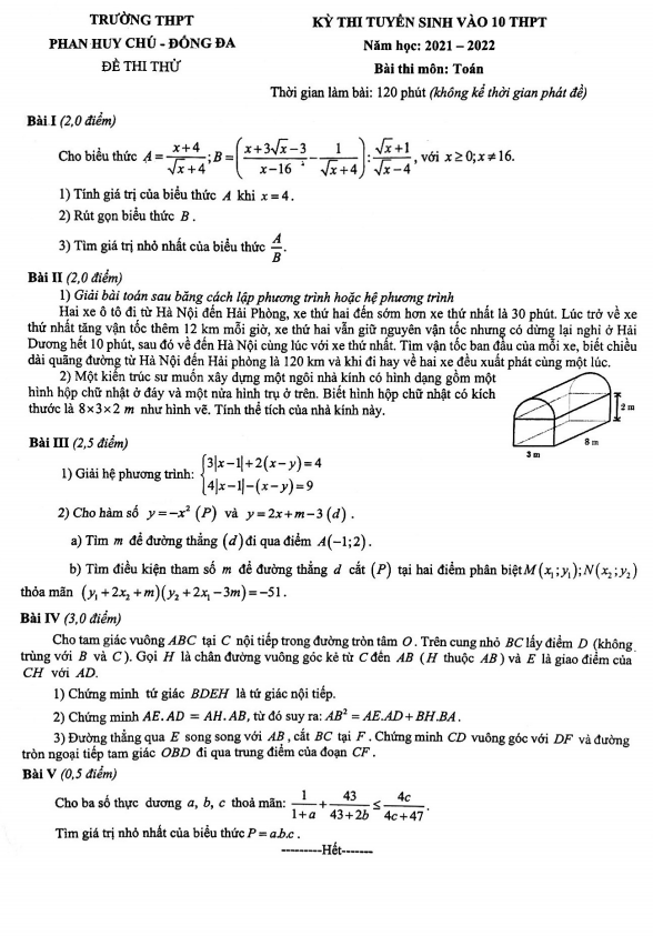 Đề thi thử Toán vào 10 năm 2021-2022 trường THPT Phan Huy Chú Hà Nội