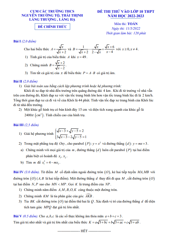 Xin chào quý thầy cô và các em học sinh! Sytu hân hạnh giới thiệu đến quý vị đề thi thử môn Toán tuyển sinh vào lớp 10 năm học 2022-2023 của cụm các trường THCS quận Đống Đa, thành phố Hà Nội, bao gồm THCS Nguyễn Trường Tộ, THCS Thái Thịnh, THCS Láng Thượng, THCS Láng Hạ. Kỳ thi sẽ diễn ra vào ngày 11 tháng 05 năm 2022, với đề thi có đáp án, lời giải chi tiết và hướng dẫn chấm điểm.