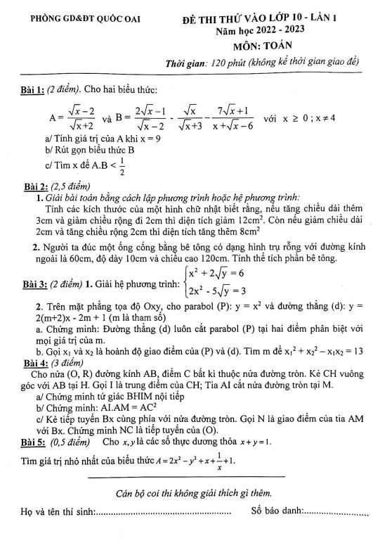 Đề thi thử Toán vào lần 1 năm 2022 2023 phòng GD ĐT Quốc Oai Hà Nội