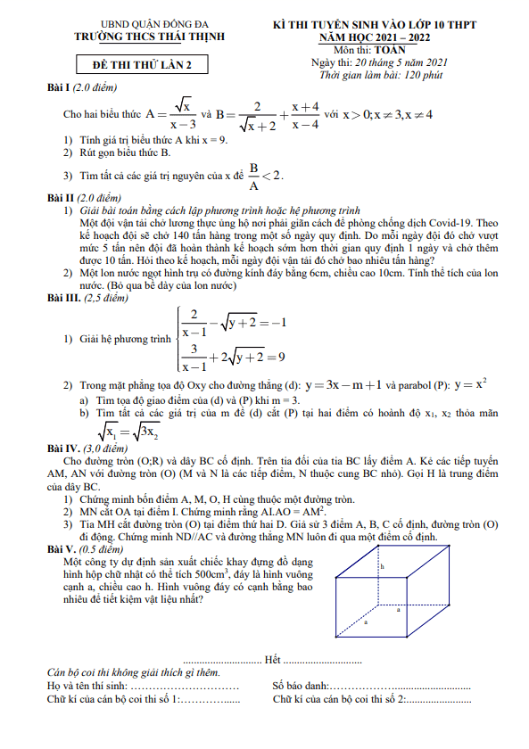 Đề thi thử Toán vào lớp 10 lần 2 năm 2021 – 2022 trường THCS Thái Thịnh, Hà Nội