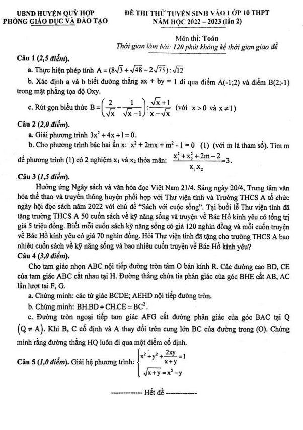 Đề thi thử Toán vào lần 2 năm 2022 2023 phòng GD ĐT Quỳ Hợp Nghệ An