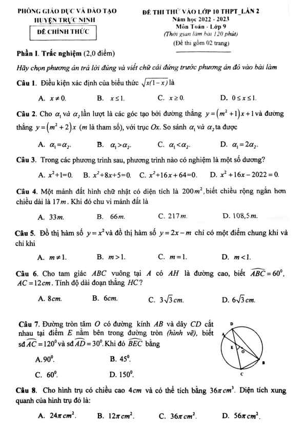 Đề thi thử Toán vào lần 2 năm 2022 2023 phòng GD ĐT Trực Ninh Nam Định