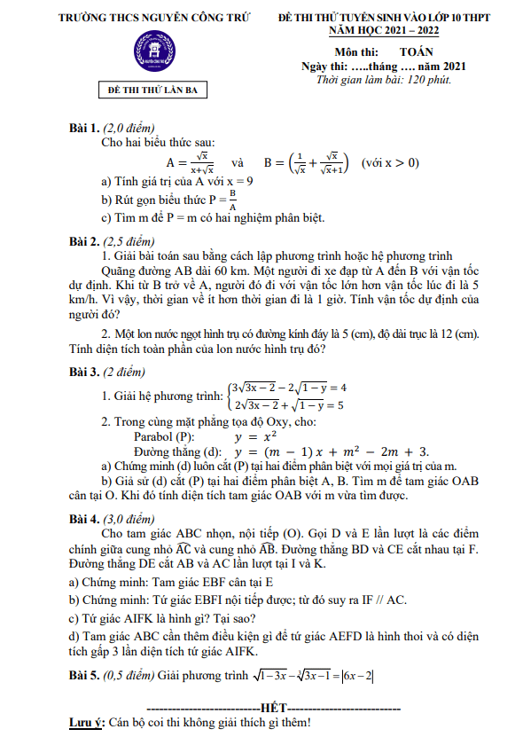 Đề thi thử Toán vào năm 2021-2022 lần 3 trường Nguyễn Công Trứ Hà Nội