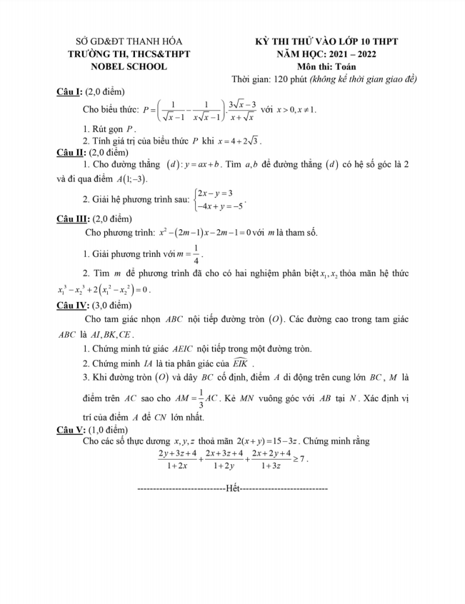 Đề Thi Thử Toán Năm 2021-2022 Trường Nobel School Thanh Hóa