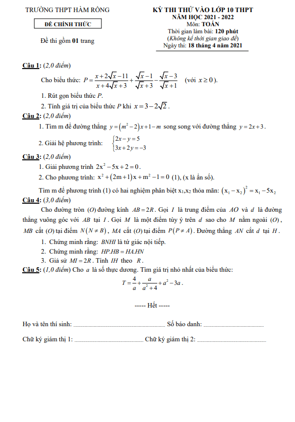 Bên dưới là một đoạn trích từ đề thi thử Toán vào lớp 10 năm 2021 – 2022 trường THPT Hàm Rồng – Thanh Hóa: