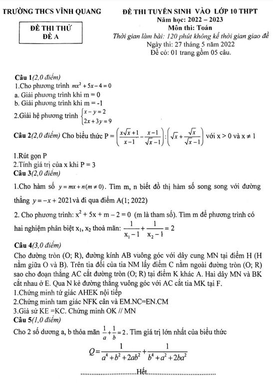 Đề thi thử Toán vào năm 2022-2023 trường THCS Vĩnh Quang Thanh Hóa