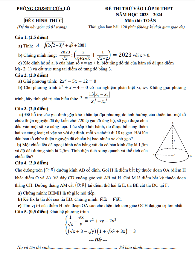 Trích dẫn đề thi thử Toán vào lớp 10 năm 2023-2024 của phòng GD&ĐT Cửa Lò-Nghệ An: