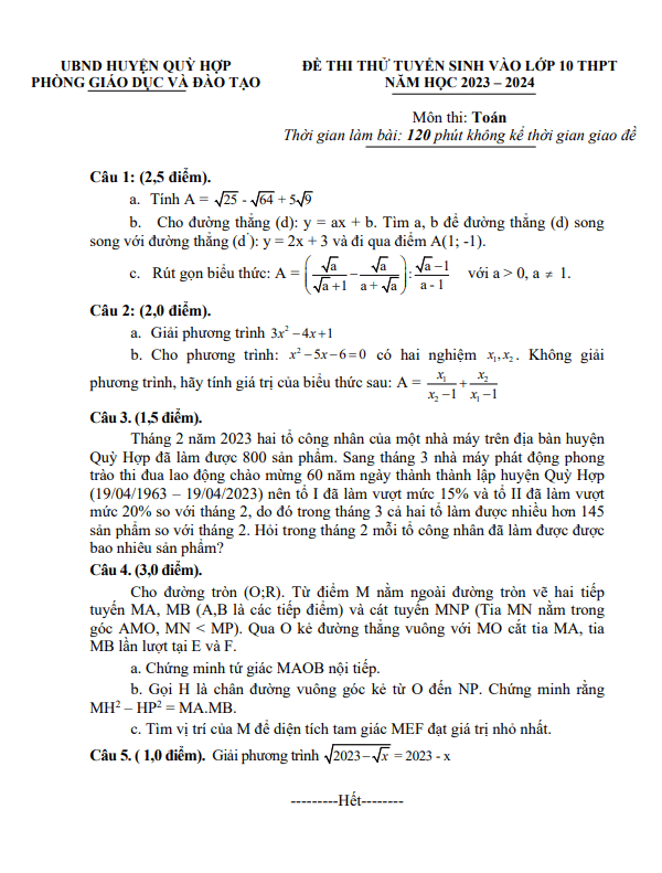 Đề thi thử Toán vào năm 2023 – 2024 tại Quỳ Hợp, Nghệ An