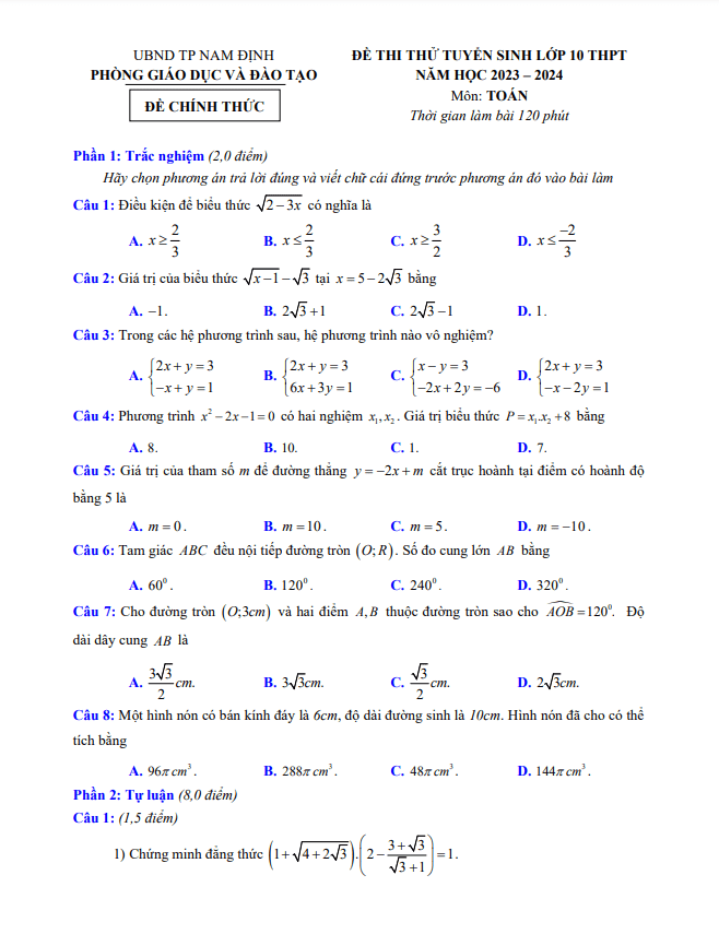 Đề thi thử Toán vào năm 2023-2024 phòng GD&ĐT thành phố Nam Định