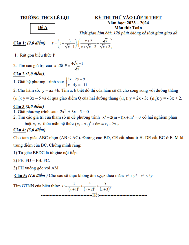 Đề thi thử Toán vào năm 2023 – 2024 trường THCS Lê Lợi Thanh Hóa