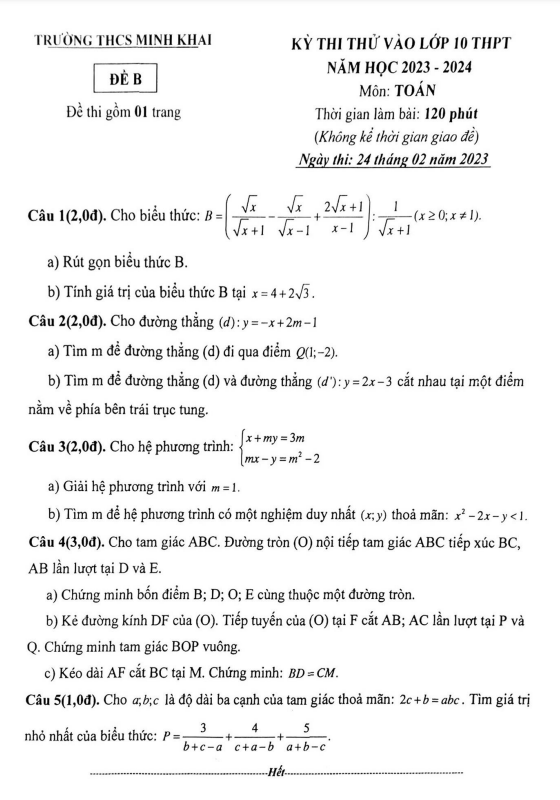 Đề thi thử Toán vào năm 2023-2024 trường THCS Minh Khai Hà Nội
