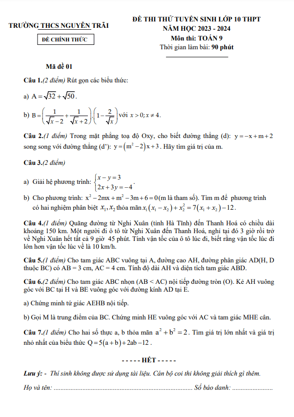 Chúng tôi xin giới thiệu đến quý thầy cô và các em học sinh lớp 9 đề thi thử môn Toán tuyển sinh vào lớp 10 THPT năm học 2023-2024 của trường THCS Nguyễn Trãi, Hà Tĩnh. Đề thi có đáp án và hướng dẫn chấm điểm cho mã đề 01 và mã đề 02.