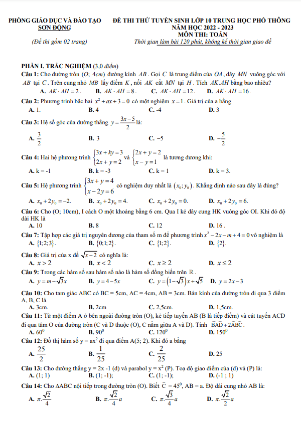 Đề thi thử Toán vào năm 2023 phòng GD ĐT Sơn Động Bắc Giang