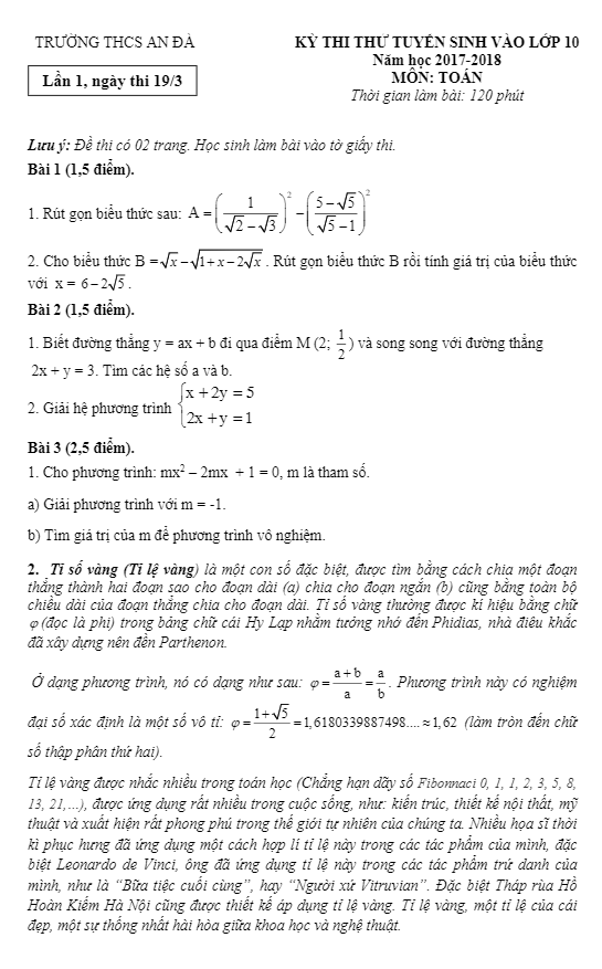 Đề thi thử tuyển sinh vào lớp 10 năm 2017 môn Toán trường THCS An Đà – Hải Phòng lần 1 bao gồm 5 câu hỏi tự luận. Dưới đây là một số bài toán đáng chú ý:
