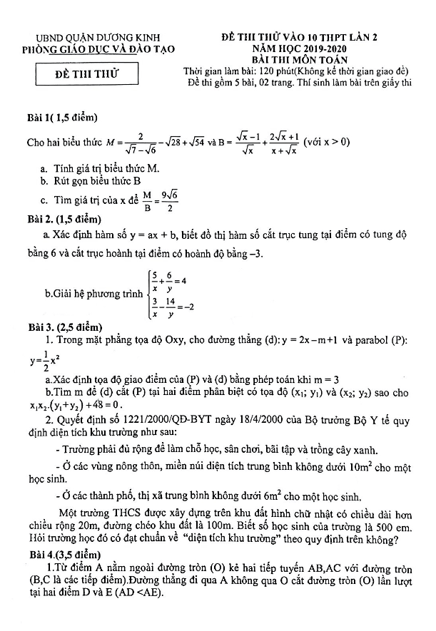 Đề thi thử vào 10 lần 2 năm 2019 – 2020 môn Toán phòng GD&ĐT Dương Kinh Hải Phòng