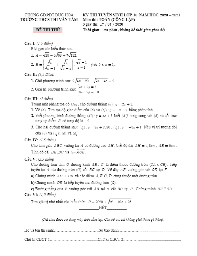 Đề thi thử vào 10 năm 2020 2021 môn Toán trường THCS Thi Văn Tám Long An