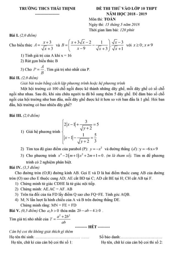 Đề thi thử vào lớp 10 môn Toán lớp 2018 trường THCS Thái Thịnh – Hà Nội được biên soạn theo hình thức tự luận với 5 bài toán. Thời gian làm bài là 120 phút, kỳ thi diễn ra vào ngày 15 tháng 05 năm 2018. Mục tiêu của đề thi là giúp các học sinh lớp 9 làm quen với hình thức thi cử, nắm rõ cấu trúc đề và các dạng toán thường gặp.
