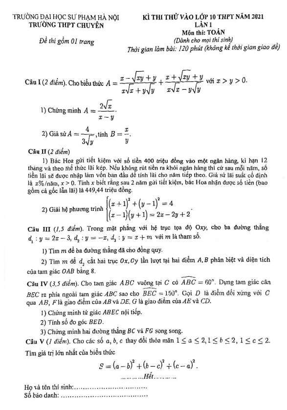 Đề thi thử vào lớp 10 môn Toán lần 1 năm 2021 trường chuyên ĐHSP Hà Nội