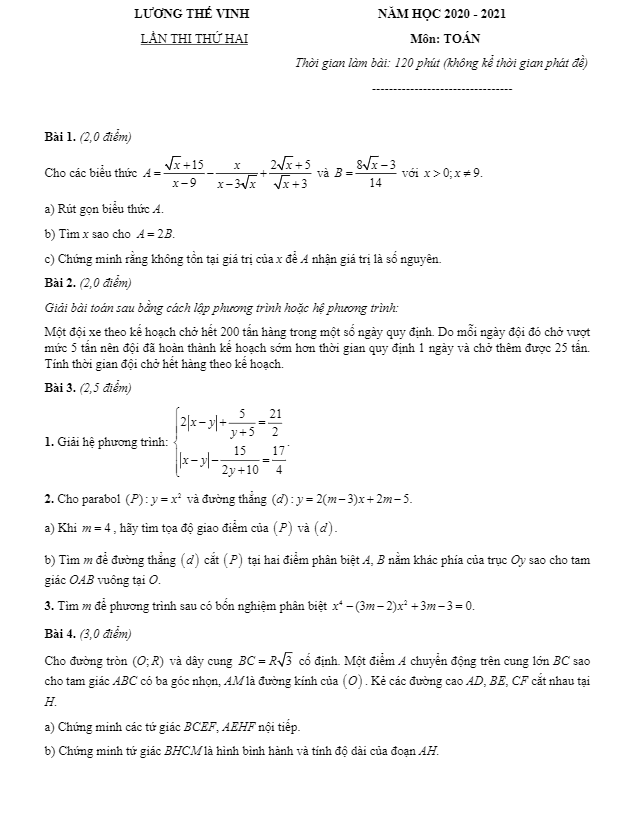 Đề thi thử vào môn Toán lần 2 năm 2020 2021 trường Lương Thế Vinh Hà Nội