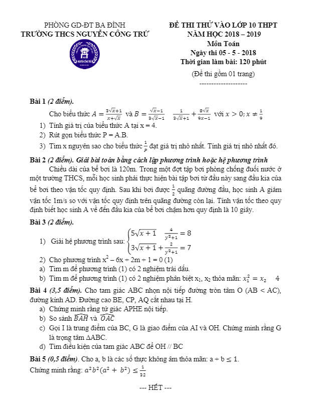 Đề thi thử vào môn Toán năm 2018 – 2019 trường Nguyễn Công Trứ Hà Nội