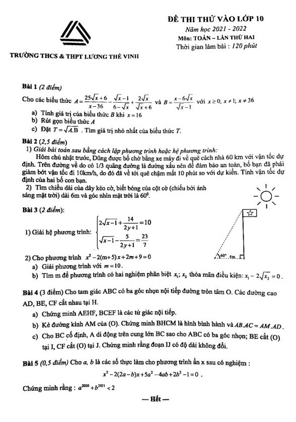 Đề thi thử vào lớp 10 Toán năm 2021 – 2022 trường Lương Thế Vinh Hà Nội