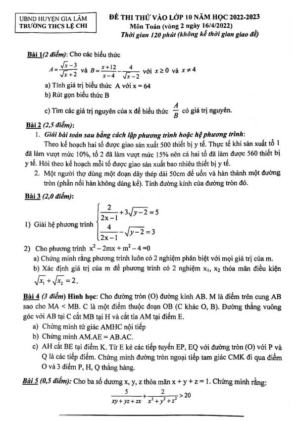 Xin chào quý thầy cô và các em học sinh lớp 9! Hôm nay, Sytu xin giới thiệu đến các bạn đề thi thử tuyển sinh vào lớp 10 THPT môn Toán năm học 2022-2023 của trường THCS Lệ Chi, huyện Gia Lâm, thành phố Hà Nội. Kỳ thi sẽ diễn ra vào ngày 16 tháng 04 năm 2022. Hãy cùng chúng tôi tìm hiểu chi tiết về đề thi này.