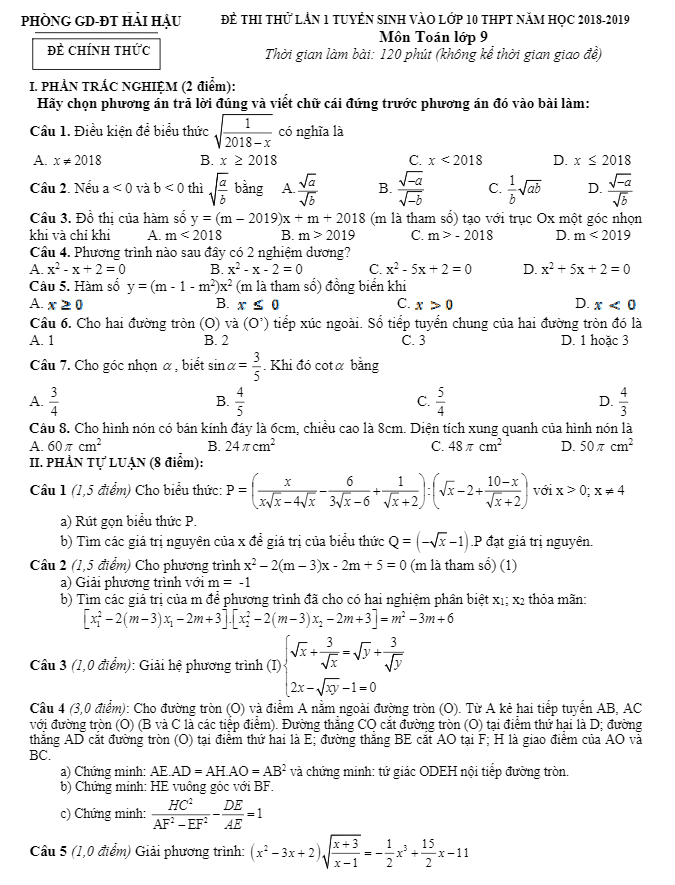 Đề thi thử lần 1 vào lớp 10 môn Toán tại phòng GD và ĐT Hải Hậu – Nam Định đã được biên soạn theo hình thức trắc nghiệm và tự luận. Đề thi bao gồm 8 câu hỏi trắc nghiệm (chiếm 20% số điểm) và 5 bài toán tự luận (chiếm 80% số điểm), giúp học sinh rèn luyện kỹ năng giải toán và làm quen với cấu trúc đề thi chính thức.