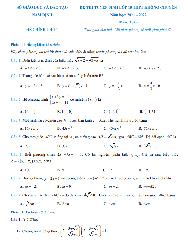 Sytu xin gửi đến quý thầy cô và các em học sinh đề thi tuyển sinh lớp 10 môn Toán năm 2021-2022 của sở GD&ĐT Nam Định. Đề thi này bao gồm đáp án và lời giải chi tiết cho từng câu hỏi.Đề thi tuyển sinh lớp 10 môn Toán năm 2021-2022 của sở GD&ĐT Nam Định có các nội dung sau:1. Mảnh đất hình chữ nhật ABCD có chiều dài AB là 6m, chiều rộng BC là 4m. Người ta trồng hoa trên phần đất là nửa hình tròn có đường kính AD và nửa đường tròn có đường kính BC, phần còn lại để trồng cỏ. Yêu cầu tính diện tích phần đất trồng cỏ (phần được tô đậm trong hình vẽ, làm tròn đến chữ số thập phân thứ nhất).2. Cho O và điểm A nằm bên ngoài đường tròn. Từ A, kẻ các tiếp tuyến AB và AC với đường tròn O (B, C là các tiếp điểm). Kẻ đường kính BD của đường tròn O. a) Chứng minh ABOC là tứ giác nội tiếp đường tròn và BDC AOC. b) Kẻ CK vuông góc với BD tại K. Gọi I là giao điểm của AD và CK. Chứng minh rằng I là trung điểm của CK.3. Tìm tọa độ của tất cả các điểm thuộc parabol y = x^2 có tung độ bằng -8.Đề thi được lưu trữ trong file Word để quý thầy cô thuận tiện trong việc tham khảo và sử dụng. Hy vọng rằng đề thi sẽ giúp các em học sinh chuẩn bị tốt cho kỳ thi sắp tới. Chúc các em thành công!