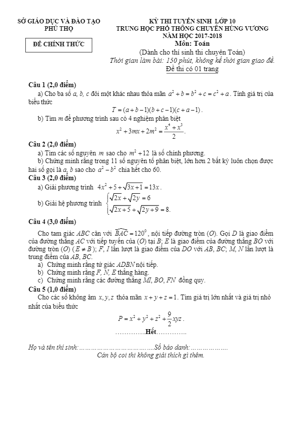 Đề thi tuyển sinh Chuyên Toán năm học 2017 – 2018 trường THPT chuyên Hùng Vương Phú Thọ