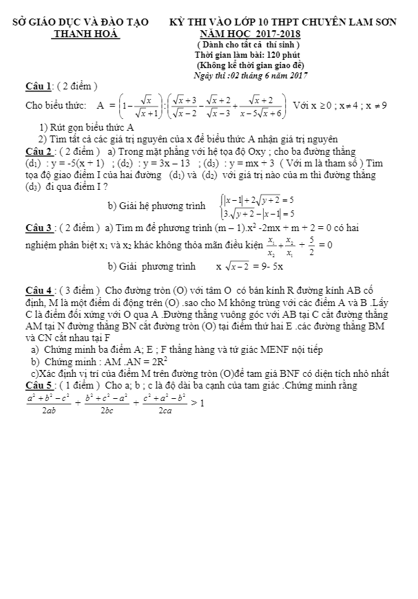 Đề thi tuyển sinh năm học 2017 2018 môn Toán trường THPT chuyên Lam Sơn Thanh Hóa