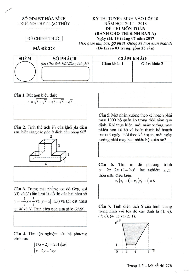 Đề thi tuyển sinh năm học 2017 2018 môn Toán trường THPT Lạc Thủy Hòa Bình (Ban A)